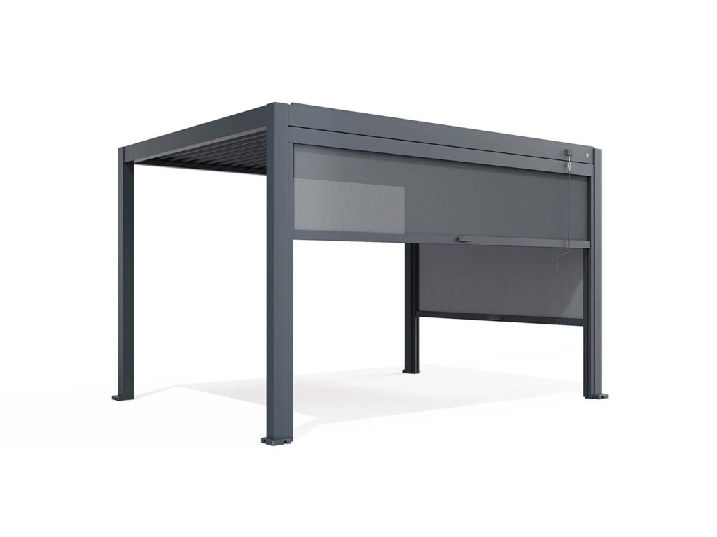 Barevné provedení antracit / bílá dokonale ladí s konstrukcí pergol PERARA a podtrhuje jejich moderní a luxusní vzhled. Roleta přirozeně zapadne do celkového designu terasy i zahrady.